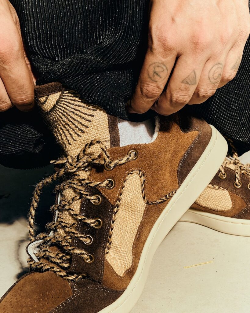 With material-first design ethos, the sneaker is crafted primarily from jute, chosen for its earthy texture and cultural resonance. The use of this humble yet resilient material connects to Raga’s lineage, symbolising strength, survival, and authenticity, while the elevated construction reflects ambition and artistry. Every stitch, texture, and contour has been purposefully designed to bridge the rawness of the streets with refined craftsmanship.