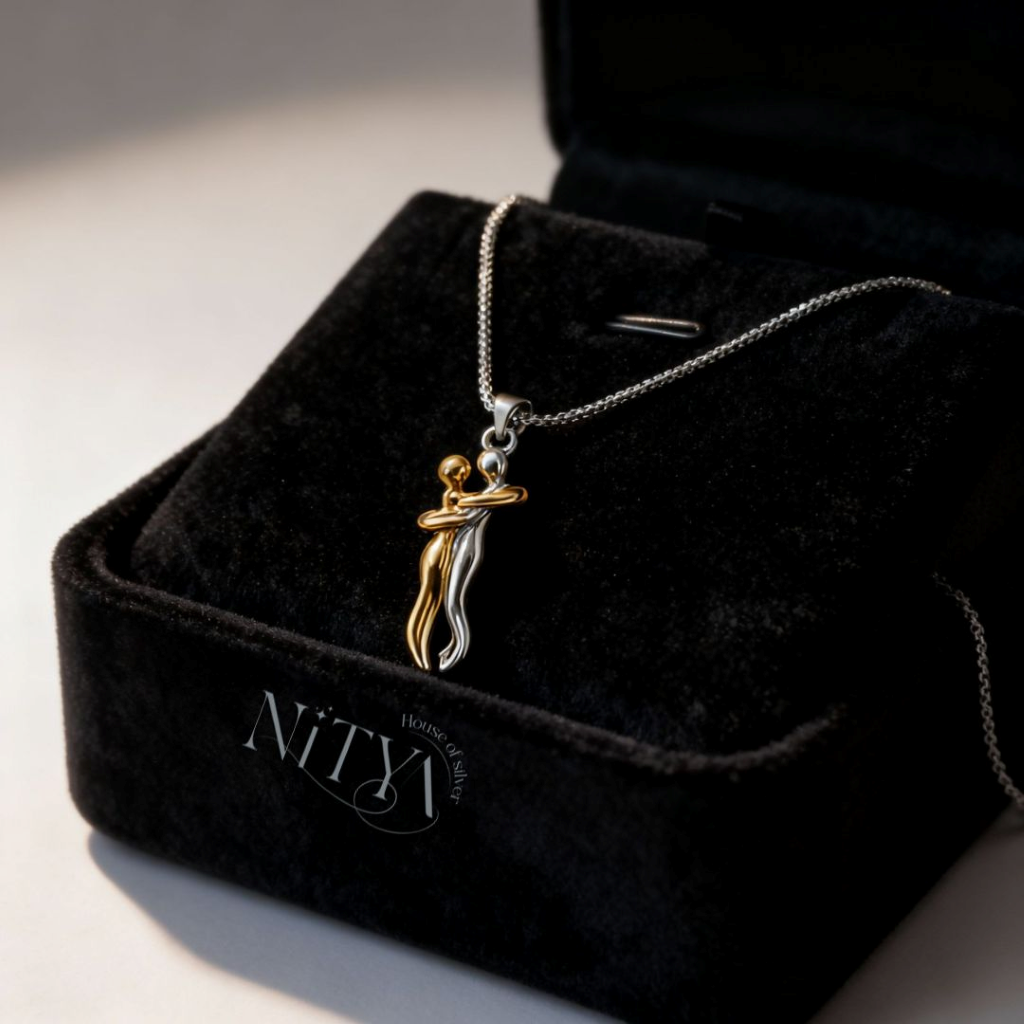The Unity of Souls Pendant beautifully weaves two forms into one a golden embrace frozen in time. A poetic expression of connection and togetherness, it’s the perfect keepsake for celebrating love that transcends boundaries. It is Modern yet deeply symbolic to love.